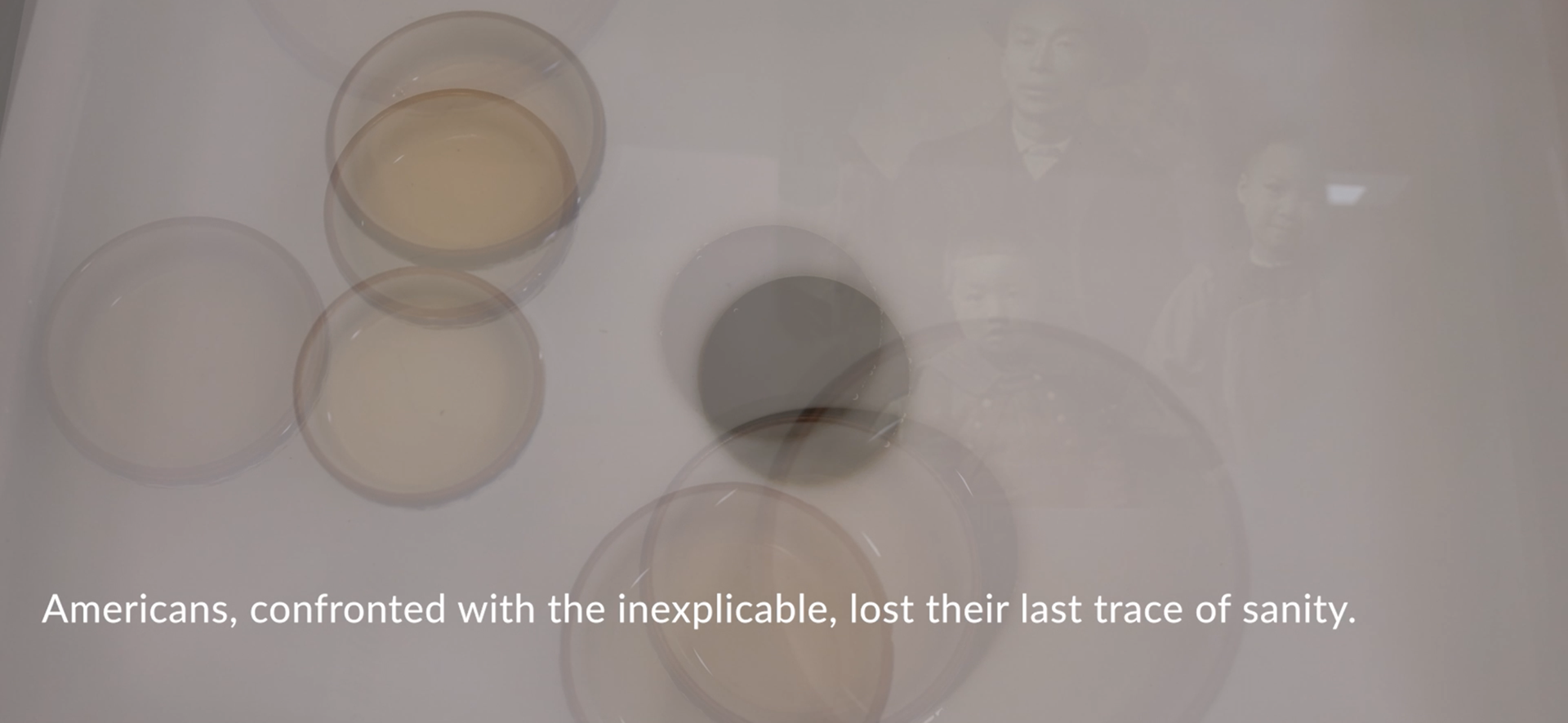 The artist uses archival materials to explore the 1882 Chinese Exclusion Act, the first U.S. law banning immigration based on race, later targeting all Asians until 1952. Rooted in racism, economic anxiety, and labor unrest, it framed Chinese migrants as "unassimilable," leading to violence and shaping racial notions of "Americanness" on stolen land. The work examines how exclusion and belonging connect to colonial legacies from the 16th-century Age of Discovery to present-day white supremacy and border politics. It questions what it means to be Chinese globally, analyzing empire, migration, and identity through post-Cold War debates like Fukuyama's and Huntington's, and reclaims narrative agency via Elizabeth Fisher's "carrier bag theory,' envisioning alternative futures of humanity and coexistence.