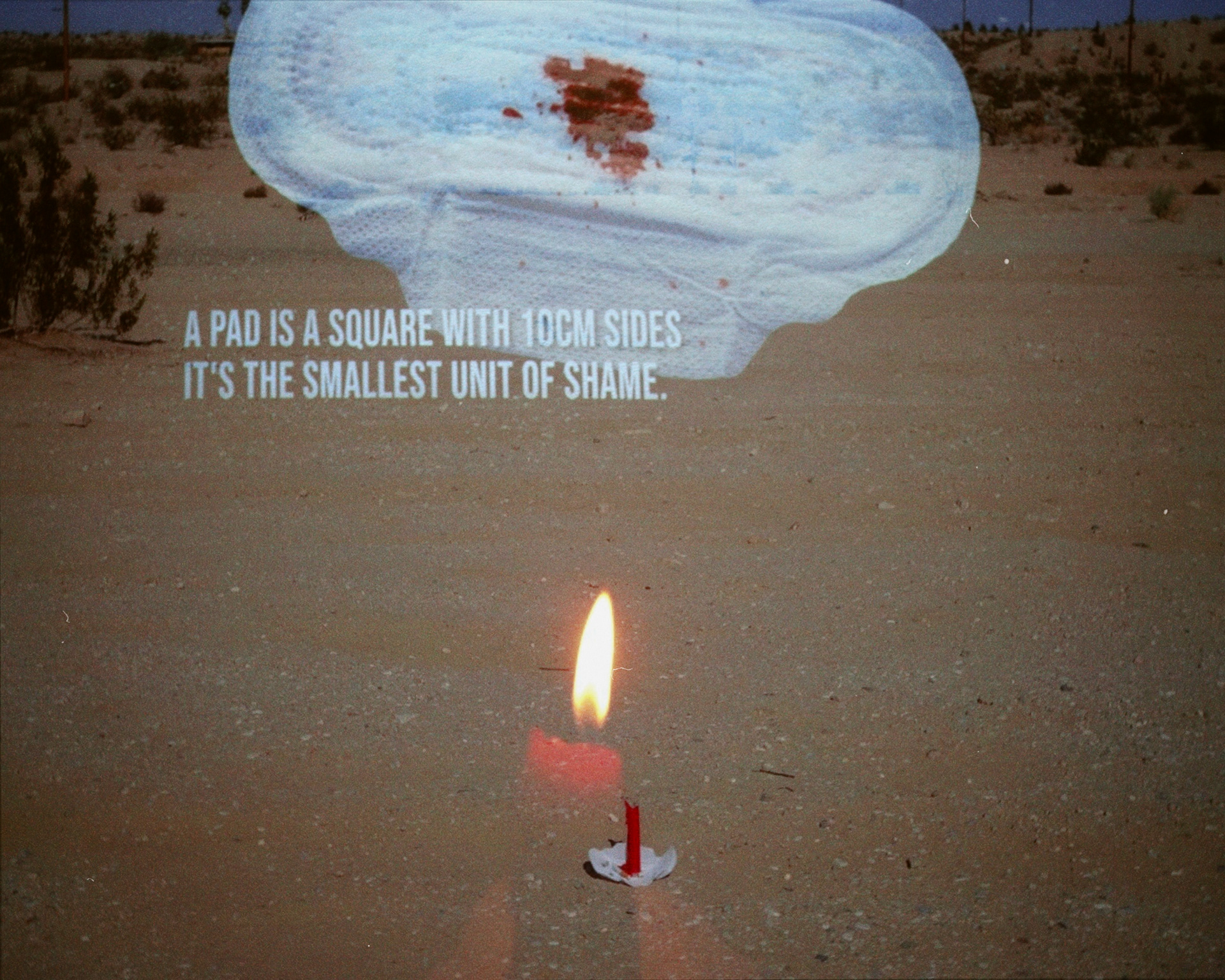 The title of the installation, Malèna, references the Italian erotic comedy-drama Malèna (2000), a quintessential example of the singular portrayal of women on screen. The film cast the griefs of war on the dichotomous narrative and imagination of a virtuous, goddess-like woman turning into a broken whore, which confines, consumes, and strips the women agency through objectification. In this work, the artist employs motifs such as menstrual blood and cigarettes as metaphors for the violence and exploitation of women by patriarchal systems. By embracing grotesque and violent imagery, the piece channels rage and challenges conservative notions of shame, creating a powerful act of defiance.